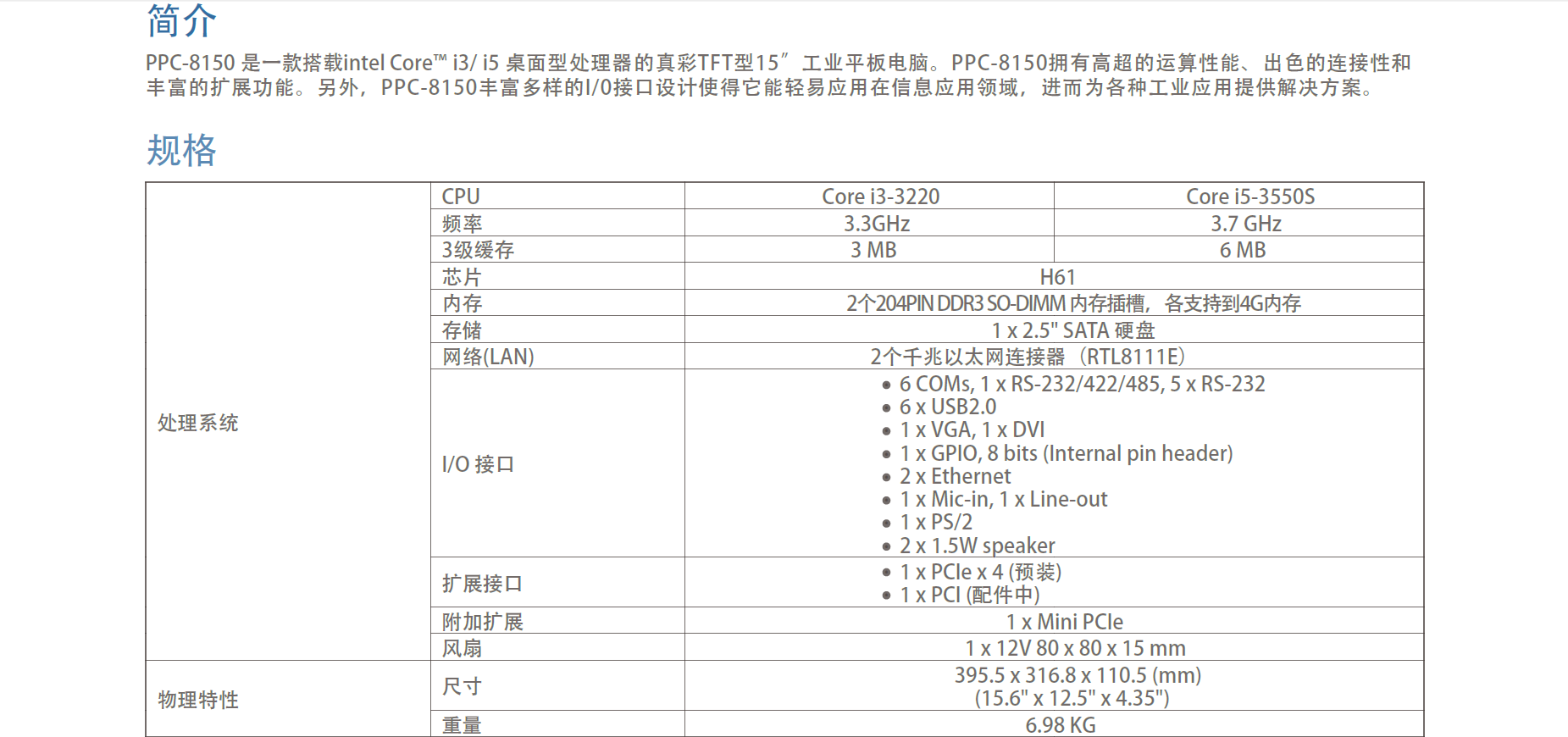 PPC-8150 是一款搭载intel Core™ i3/ i5 桌面型处理器的真彩TFT型15”工业平板电脑。PPC-8150拥有高超的运算性能、出色的连接性和丰富的扩展功能。